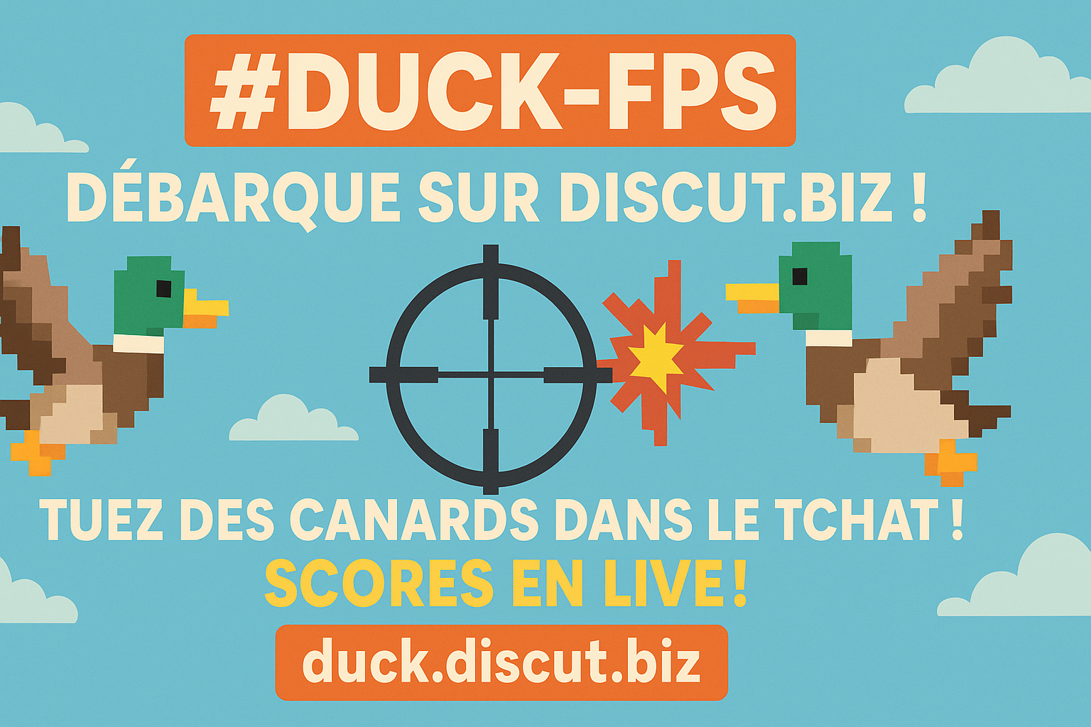 Le salon #Duck-FPS apporte une touche d’action au tchat. Ce jeu amusant reprend le célèbre Duck Hunt de MenzAgitat. Ici, tout se joue en direct, sans installation ni inscription.